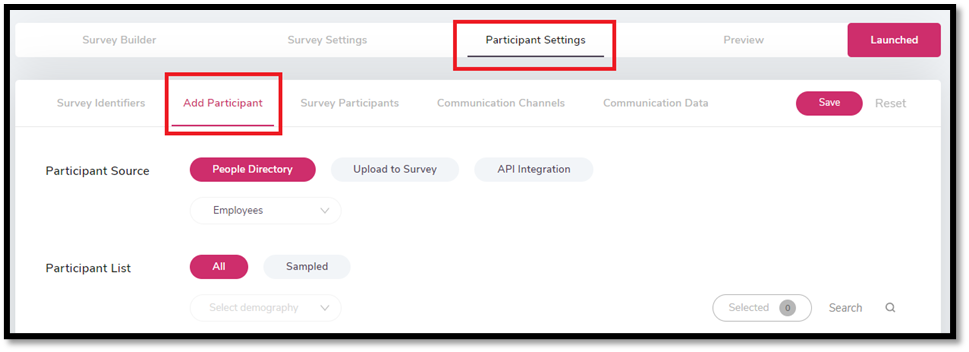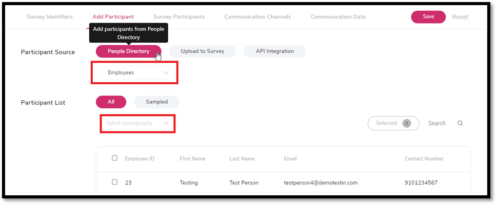 Users can add participants to the survey from the People Directory section. Users will have to select the People Source provided and filter the participants to be added as per the demographics. Users can then select the participants as per their requirement from the Participants list. All the saved participant’s data from the People Directory will be displayed under the Participants List.