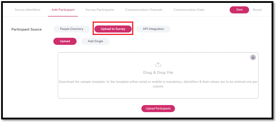Users can also add the participants by uploading a file containing the participants’ information. Users are expected to download the template from the top right of the upload column and then add the participant’s information to the downloaded template. After uploading the template, the information of the participants added in that template file will be displayed in the Survey Participants section.