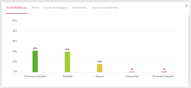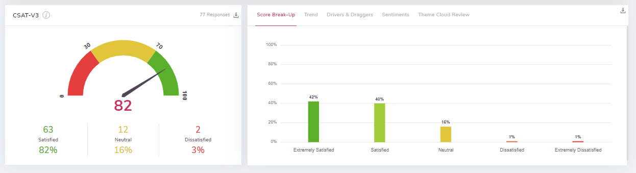 Users can verify overall responses in terms of total respondents, overall score, total satisfied, dissatisfied, and neutral scores in the count and as well in percentage as shown in the image below. To know more about the calculation logic of the CSAT, users can click on the ‘i’ icon given to the right side of the CSAT section.