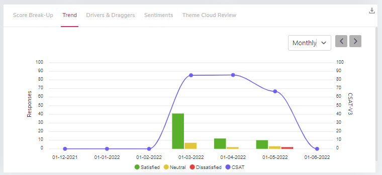 The trend graph allows users to check the report of participant responses like satisfied, neutral, or dissatisfied Trend-wise. Users can change the timeline from the dropdown as per their requirements. The score and the date also hover once the cursor is on a graph.