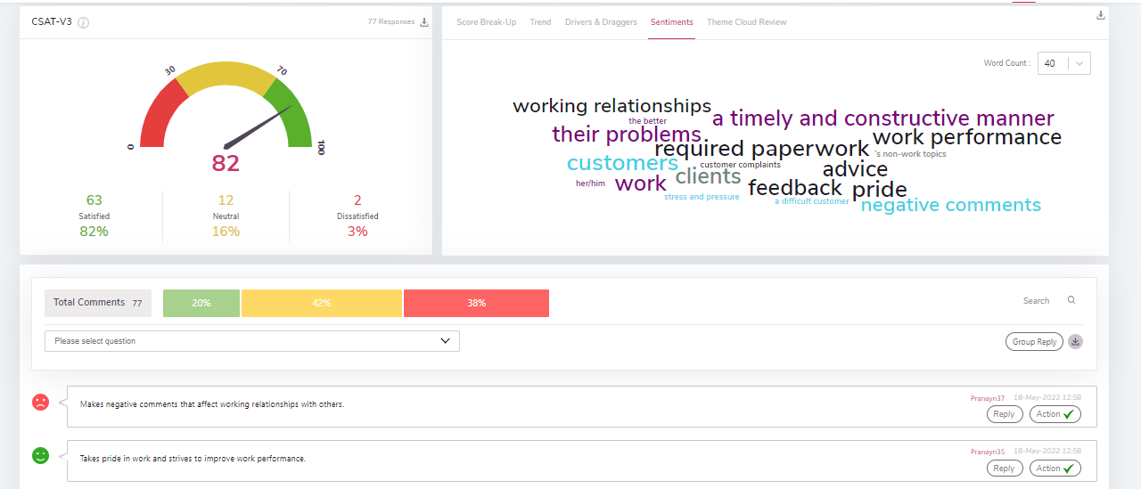 The Sentiments section shows the total comments given by the respondents in the survey. Users can also change the word count from the dropdown. As per the selected count, the number of comments will display.