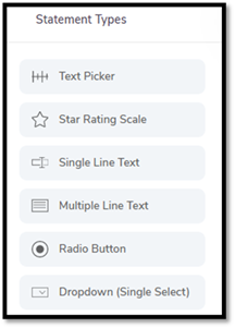 Users are facilitated with the option to create a survey by adding the statement types. Out of 21 statement types, users can select various statement types in any number and in any order as per their requirement.